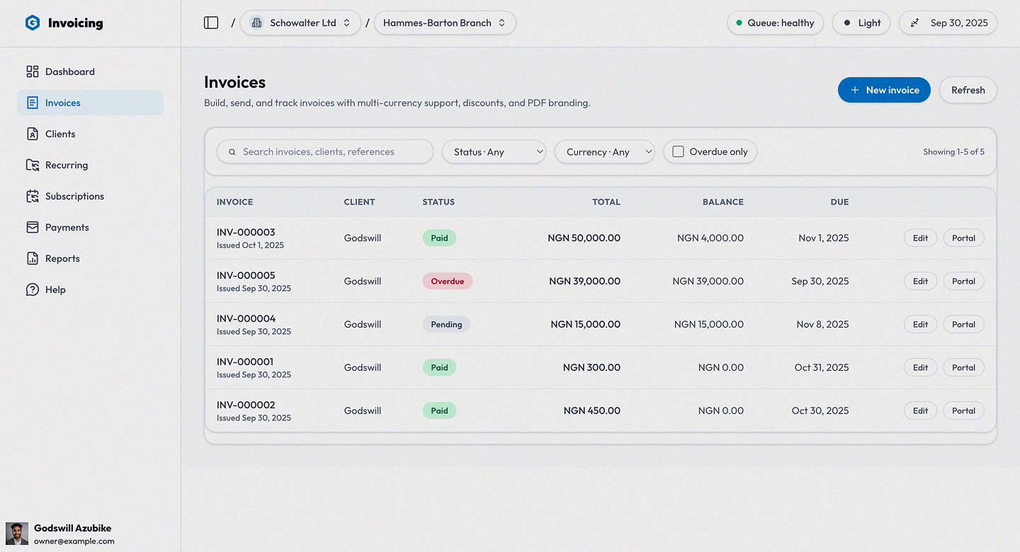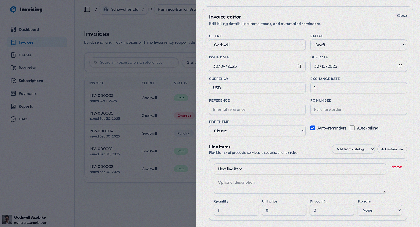 LIVESimple invoicing workspace for creating, sending, and tracking customer invoices and payments.